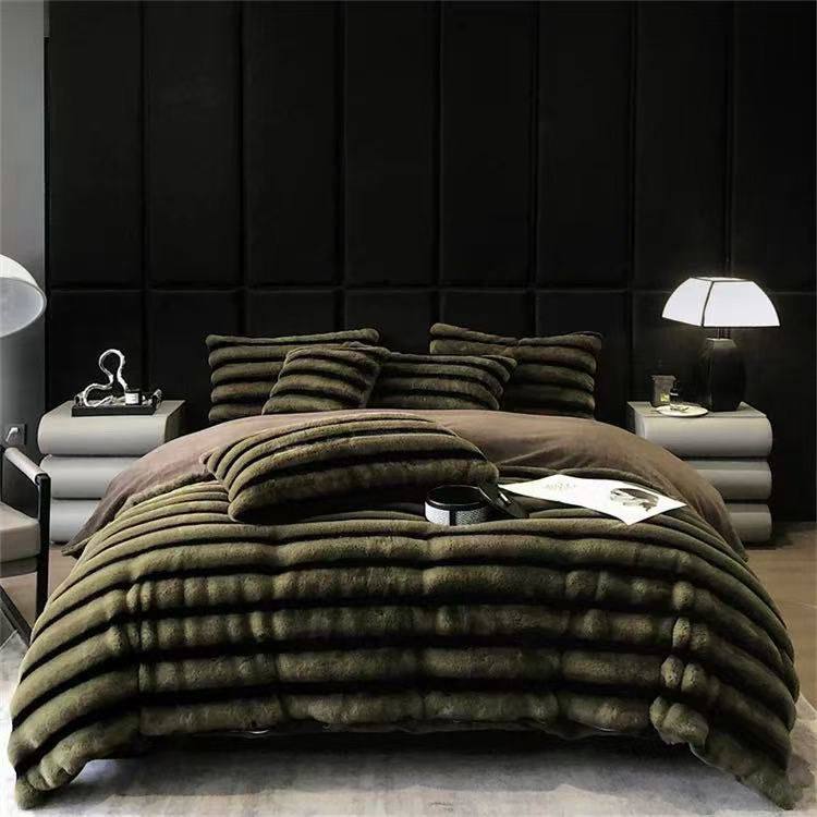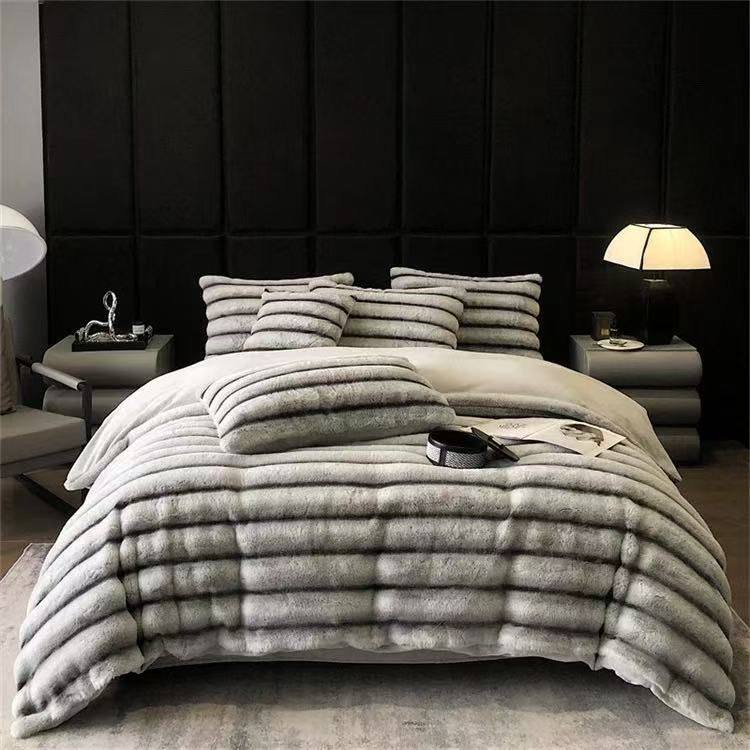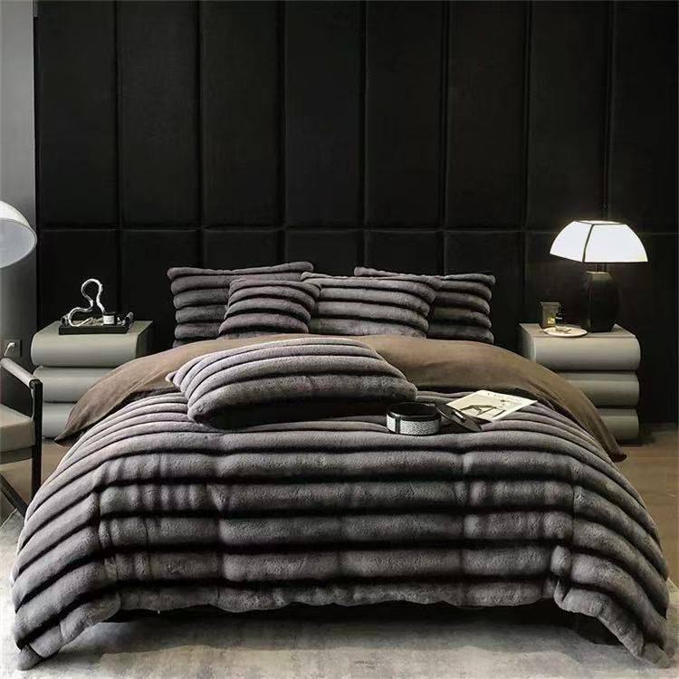 Experience unmatched elegance with our Mink Fur Striped Duvet Set. Includes 1 bedsheet and 2 pillowcases. Ultra-soft, warm, and stylish—perfect for year-round comfort. Size 6*7. Add luxury and charm to your bedroom.