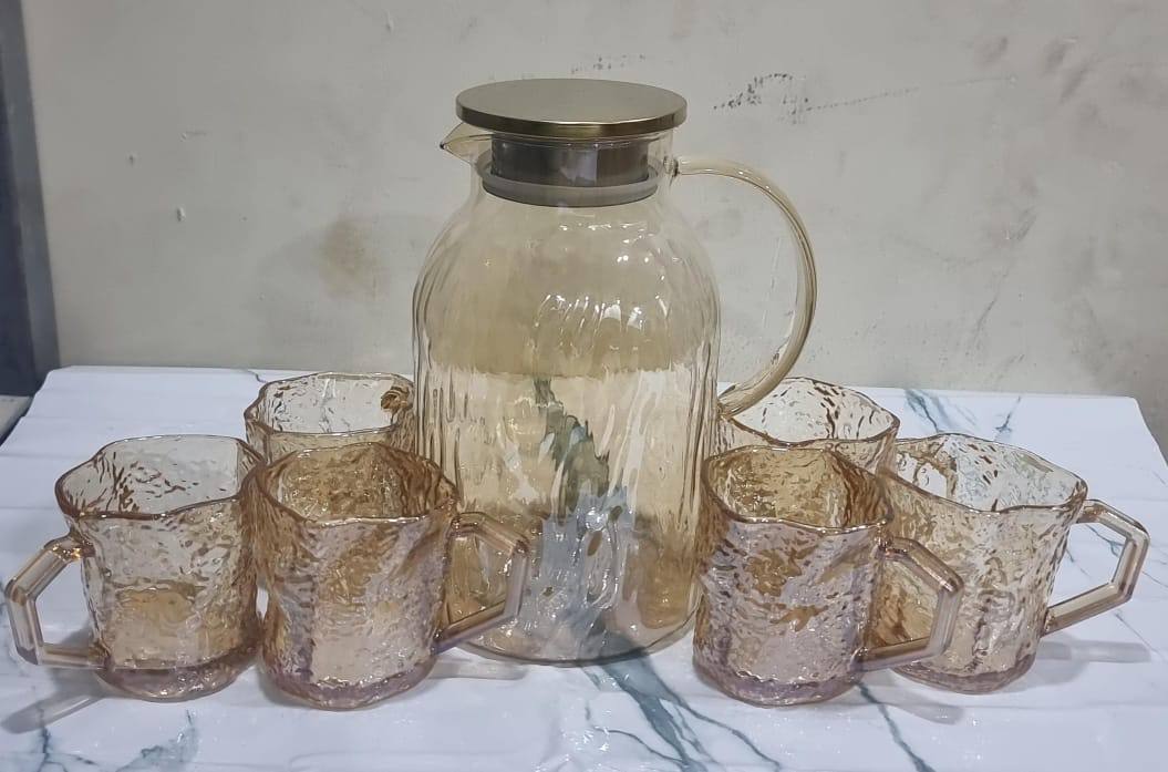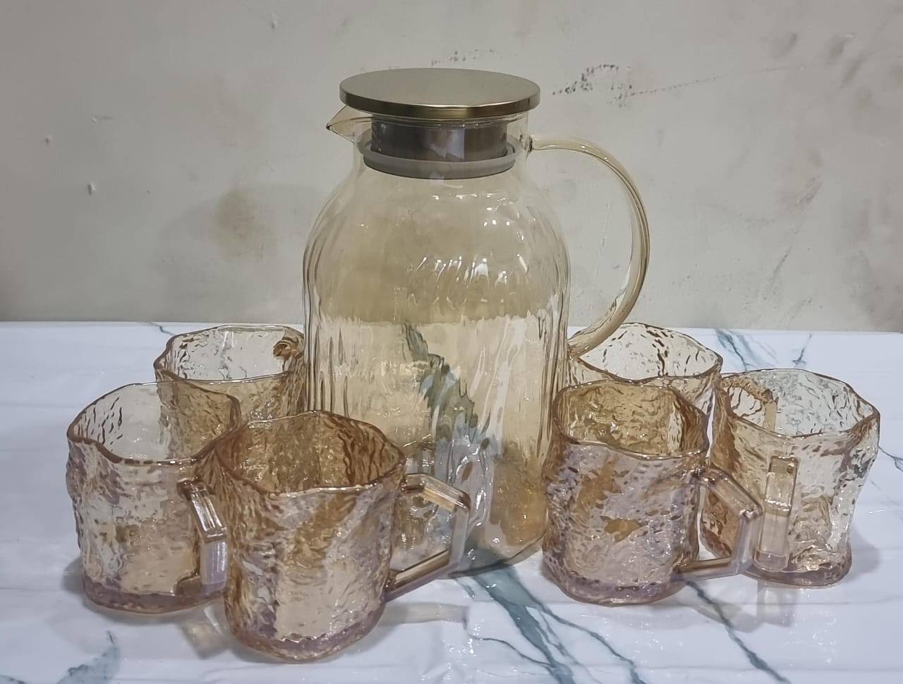 Mu Yan Golden 7-piece glass water set includes six 200ml tumblers and a 2000ml jug. Elegant and durable, perfect for serving water, juice, or cocktails with style at home, parties, or special occasions.