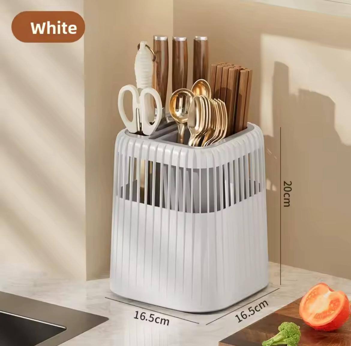 Multi-functional rotating knife & utensil rack with knife holder, chopstick box, and drain grid. Space-saving design keeps your kitchen organized. Rotates 360° for easy access, combining convenience, storage, and style for a neat, efficient cooking space.