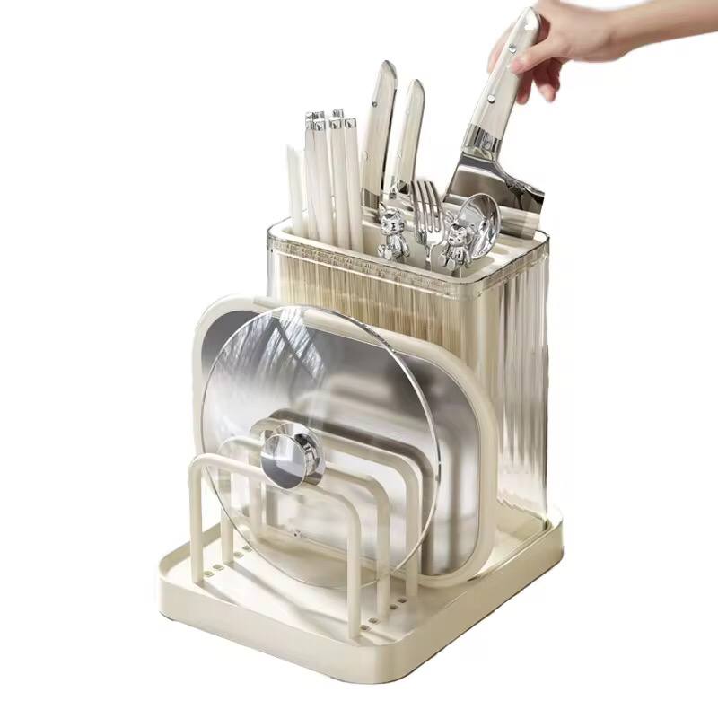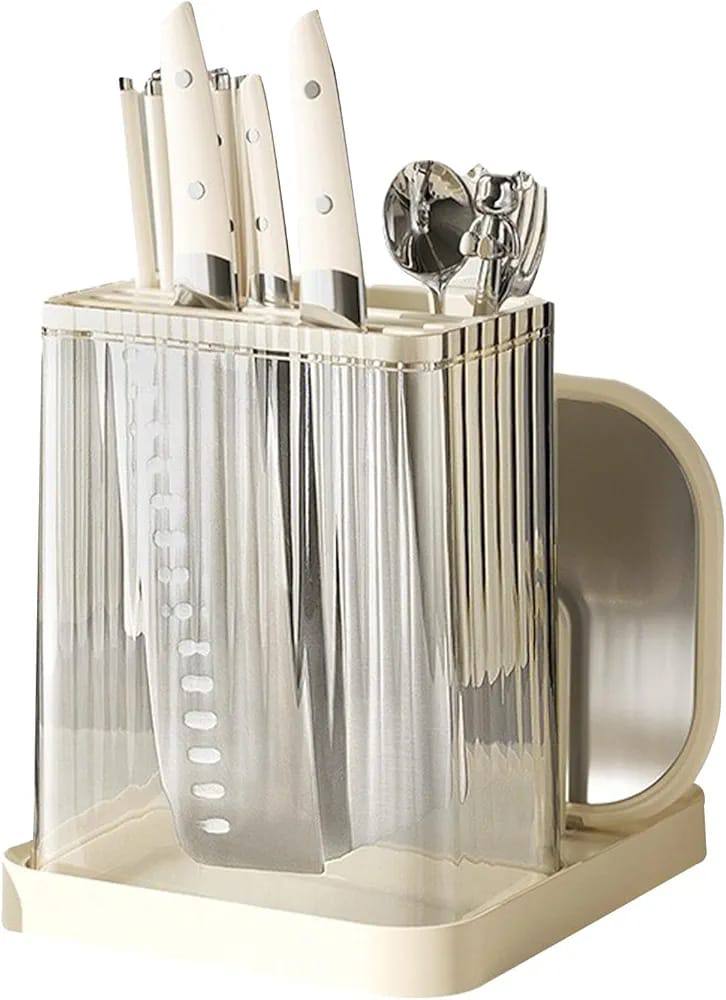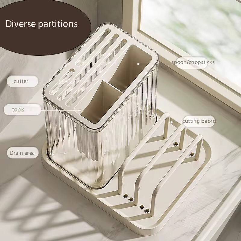 Streamline your kitchen with this multifunctional cutlery organizer. Features knife slots, ventilated chopstick holder, and adjustable chopping board rack. Made of eco-friendly ABS, it's sturdy, oil-resistant, and keeps utensils dry, organized, and accessible.