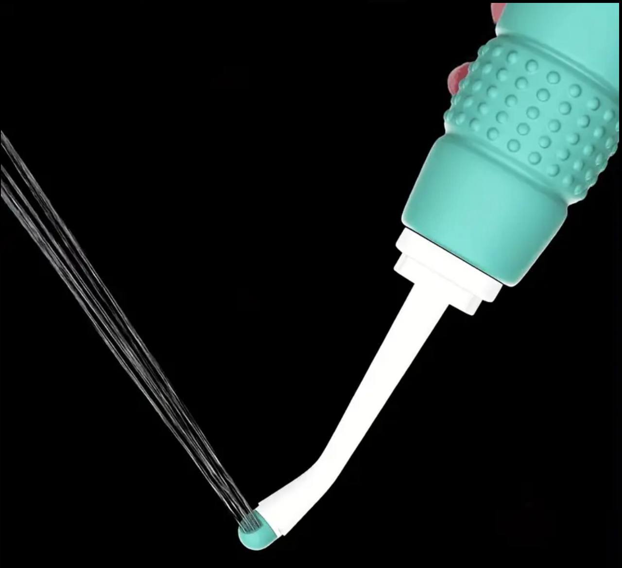 New design portable bidet, 350ml, with anti-slip handle, dual nozzles for adults and kids—straight spray for kids, side holes for adults. Comes well-packaged with storage cloth and box. Hygienic, convenient, and travel-friendly solution.