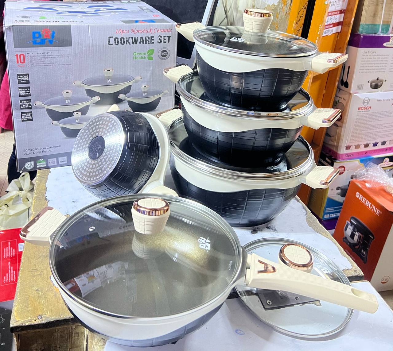 New in! Upgrade your kitchen with this 10-piece healthy ceramic-coated cookware set. Features super nonstick surface, induction compatibility, glass lids, and stay-cool handles. Eco-friendly, stylish, and perfect for safe, effortless cooking every day!