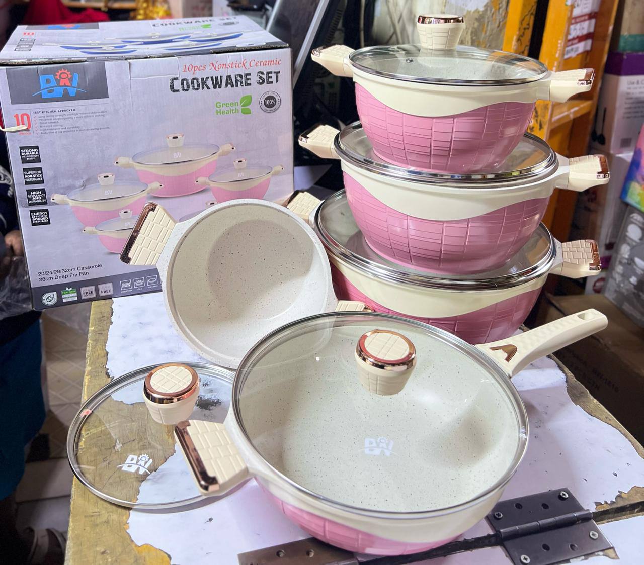 New in! Our 10pcs Green Health Label cookware set features a healthy ceramic coating, super nonstick surface, and induction compatibility. Includes glass lids and stay-cool handles—perfect for safe, stylish, and effortless everyday cooking.