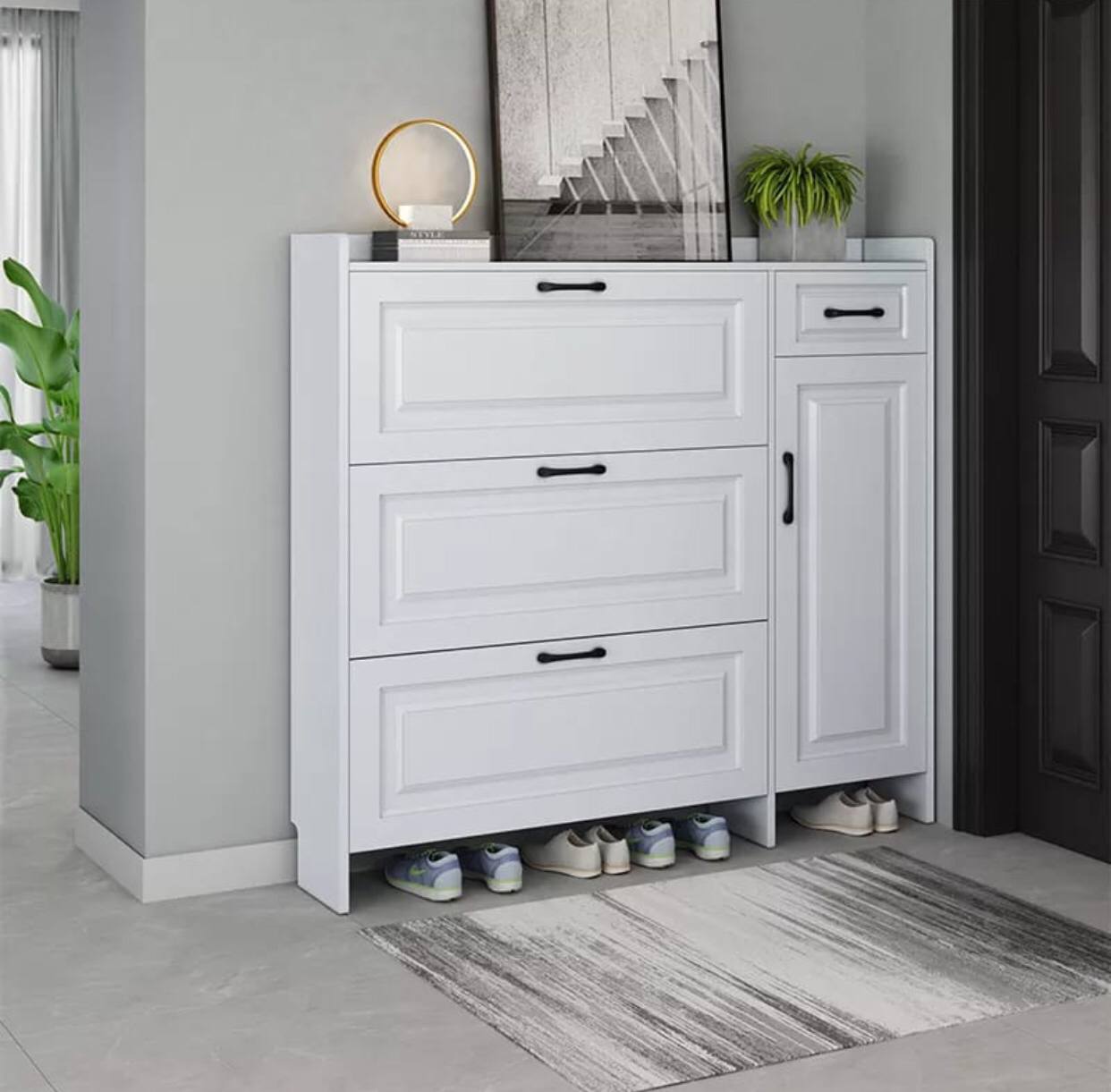 Upgrade your space with our New Model Bucket Flip Shoe Cabinet – a luxury, space-saving solution for bedrooms, living rooms, or hallways. Modern design, multi-layer storage, and high capacity in a sleek 120×100×24cm minimalist masterpiece.