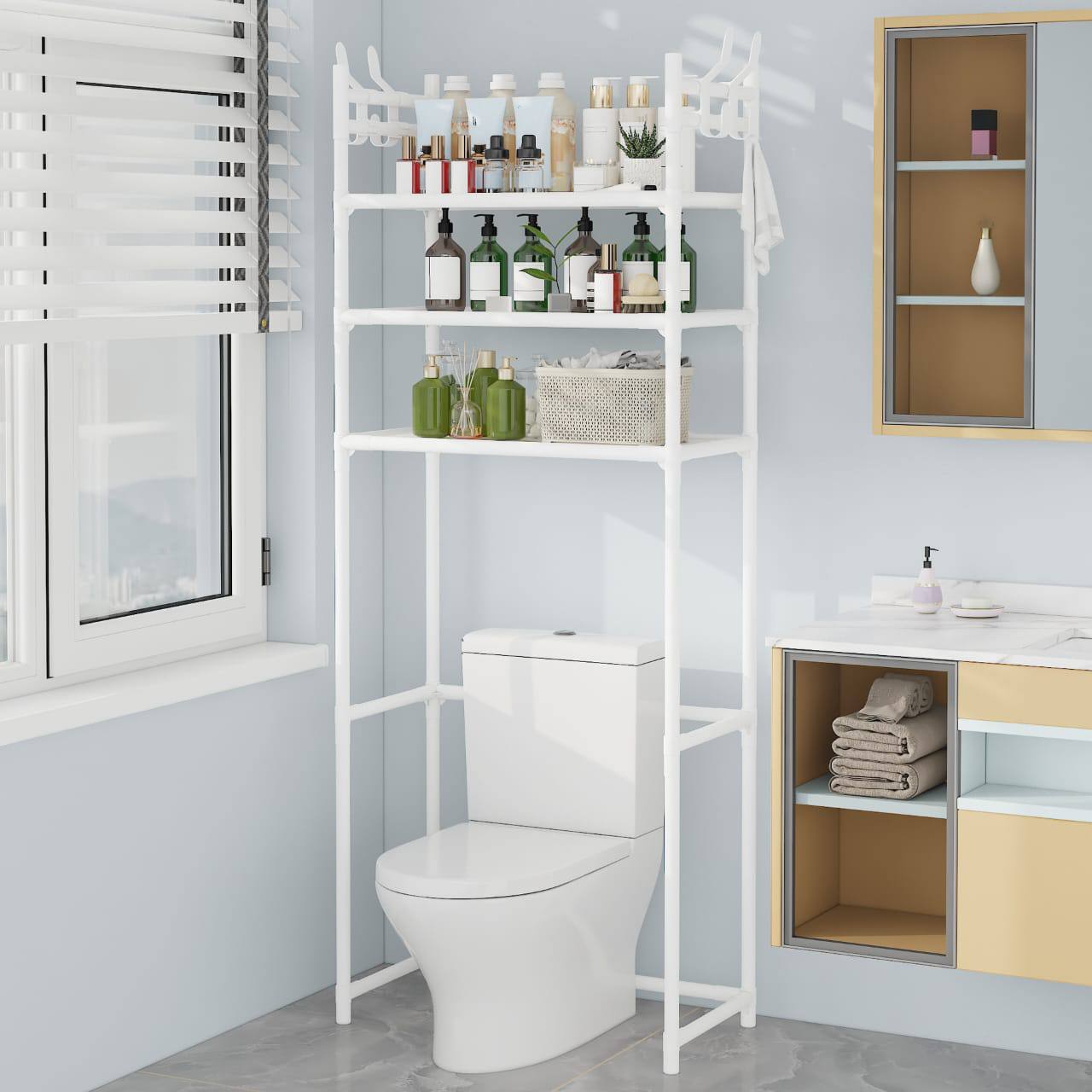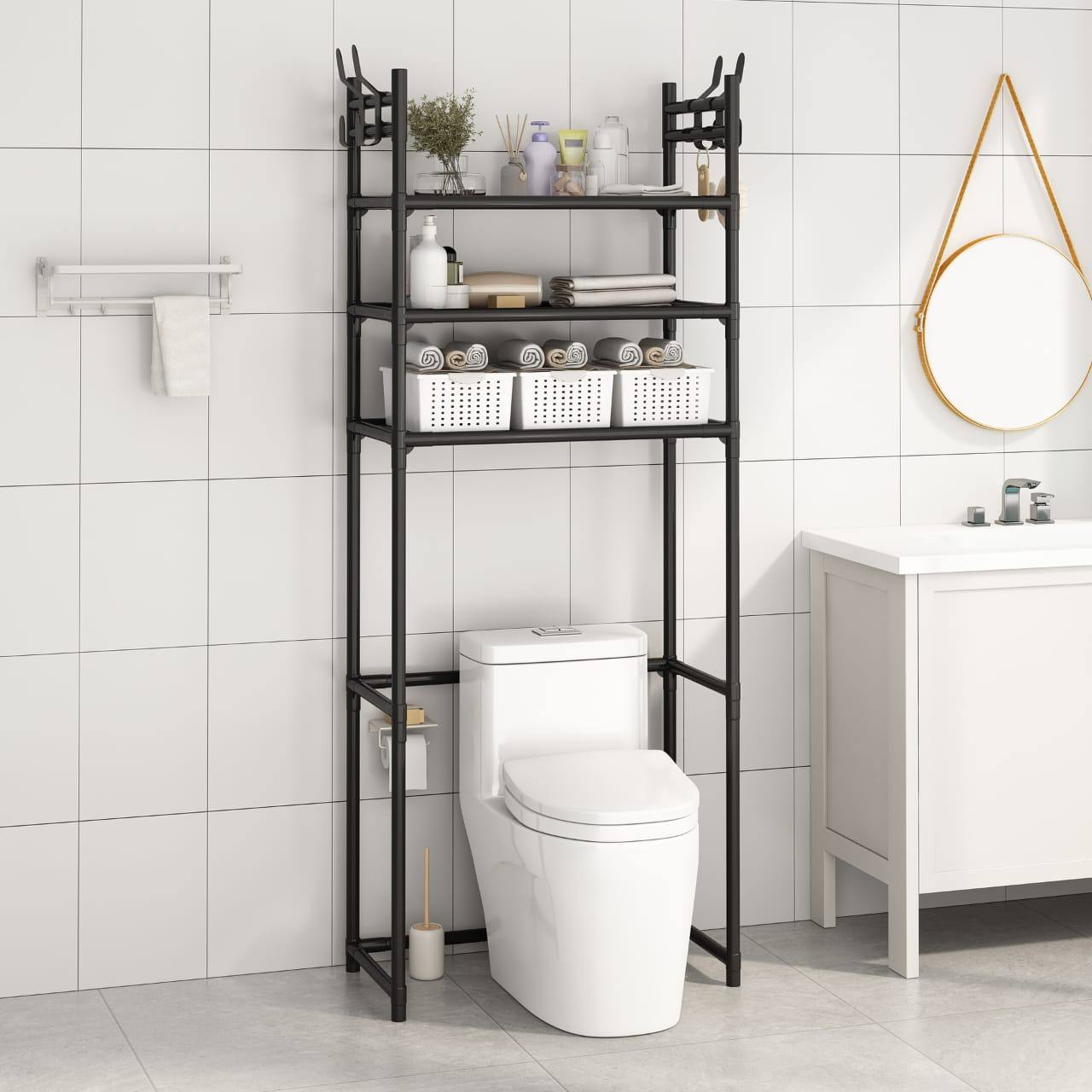 Optimize bathroom space with this new over-the-toilet organizer. Featuring a multi-layer, perforation-free, floor-standing design, it’s perfect for storing toiletries and essentials. Sleek and space-saving, available in white or black. Size: 155×26×47 cm.