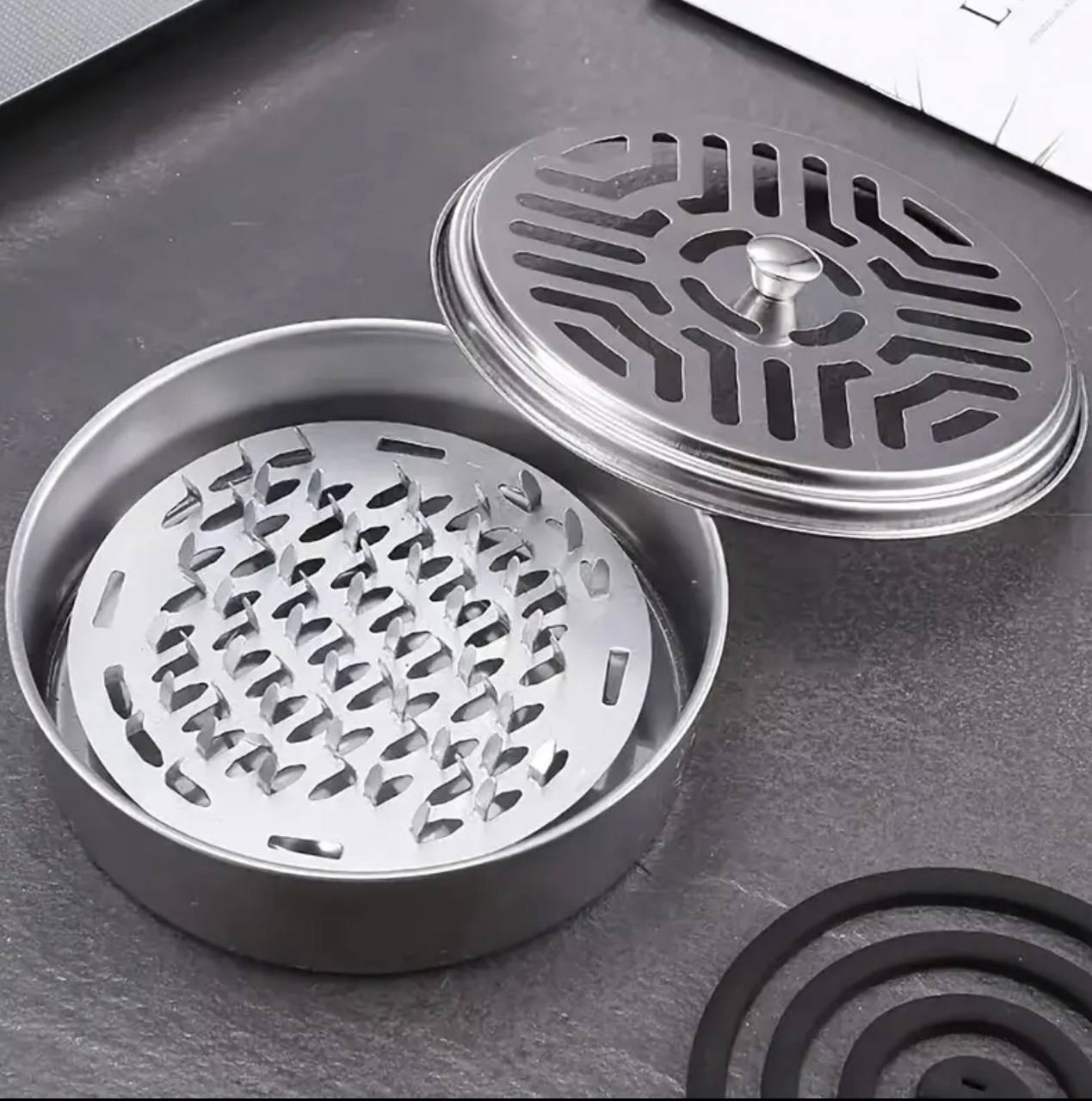Keep bugs at bay with our New Stainless Steel Mosquito Coil Holder. Fireproof and heat-resistant, it features a lid and built-in ashtray. Stylish, portable, and perfect for indoor or outdoor use. Safe and functional décor!