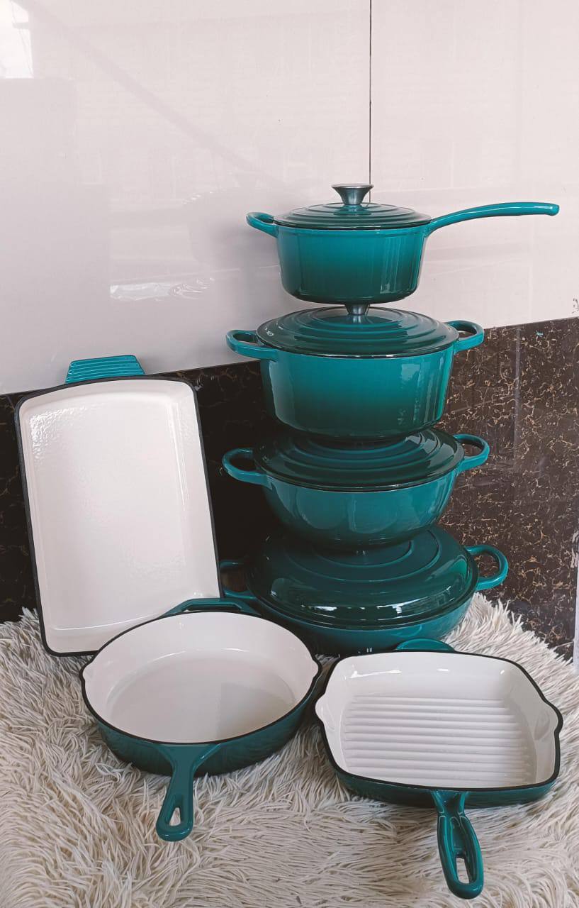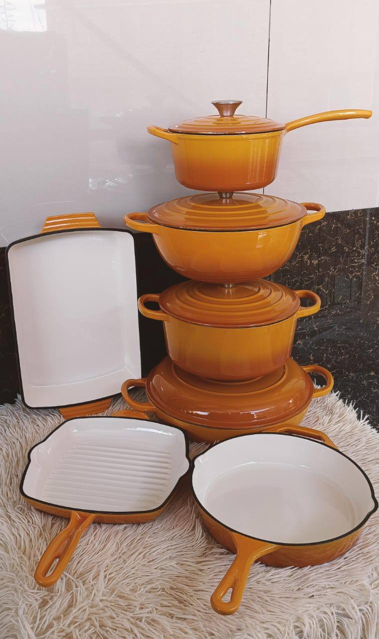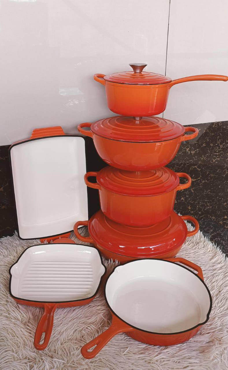 Cook like a pro with this 11-piece original enamel cast iron set. Includes 4 sufurias with lids, 1 grill pan, 1 frying pan, and 1 baking tray. Durable, stylish, and perfect for versatile, even-heat cooking.