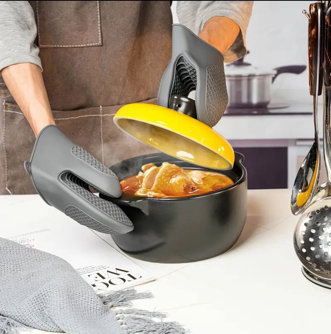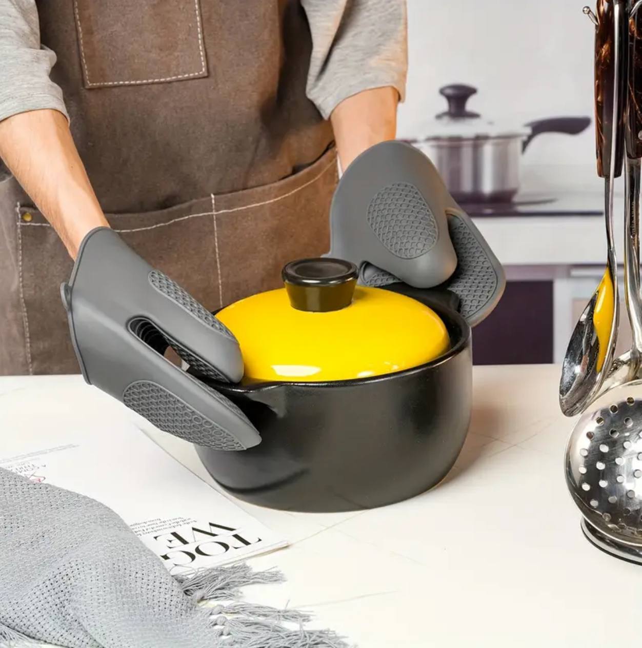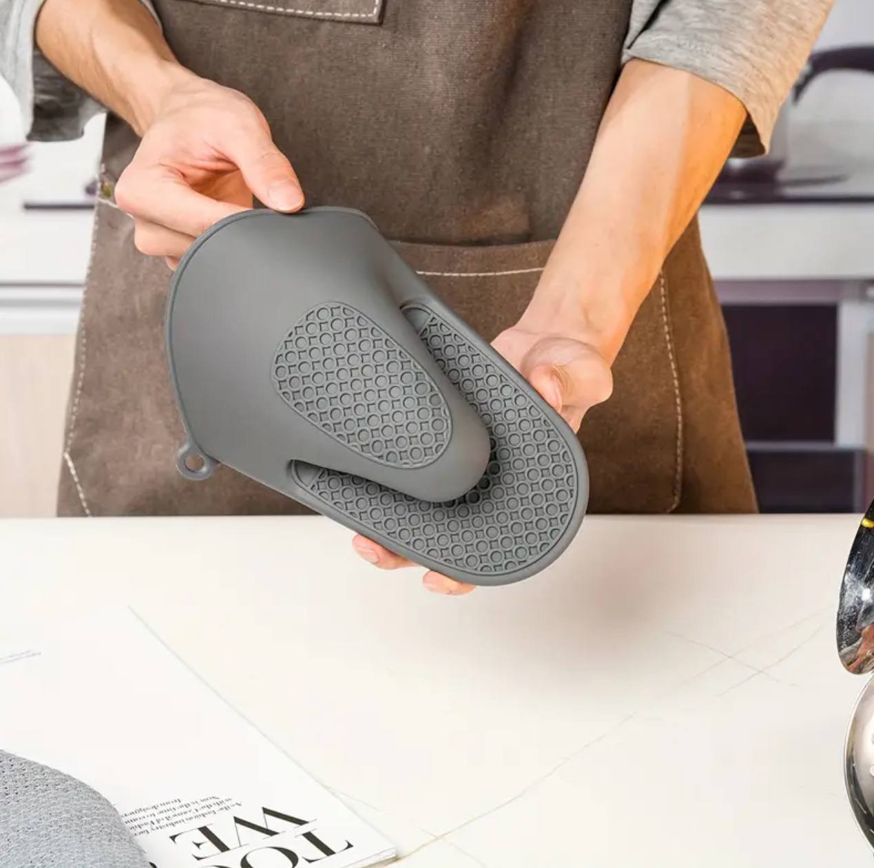 Protect your hands with our high-quality Silicone Oven Gloves/Mittens. Heat-resistant and flexible, they provide a secure grip while handling hot pots and pans. Perfect for cooking, baking, or grilling, these gloves ensure safety and comfort in the kitchen.
