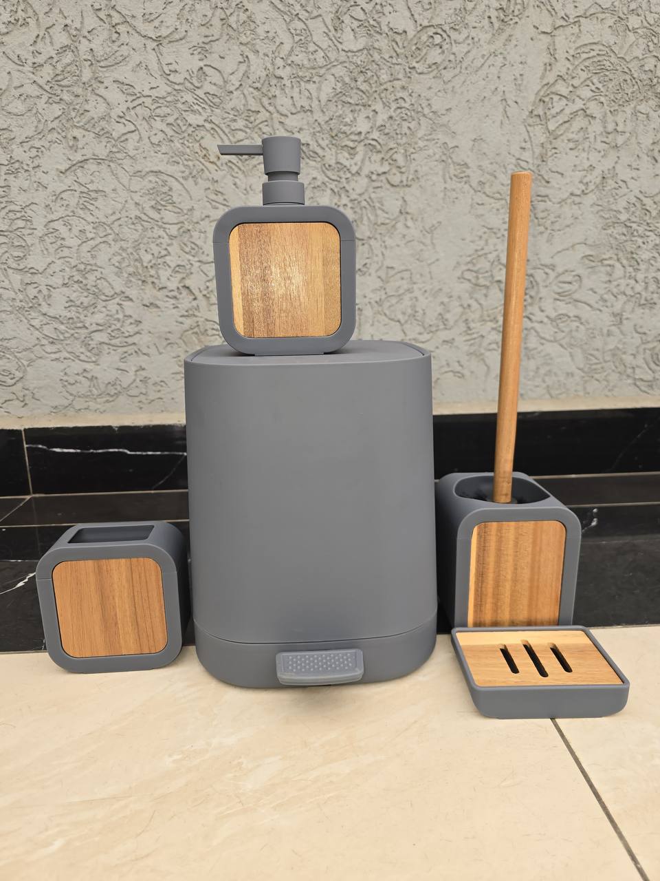 Enhance your bathroom with this sleek 6-piece plain accessories set with pedal bin! Made from high-quality, eco-friendly PP. Includes all essentials in an elegant design. Available in black, white, beige, and grey—stylish and functional.