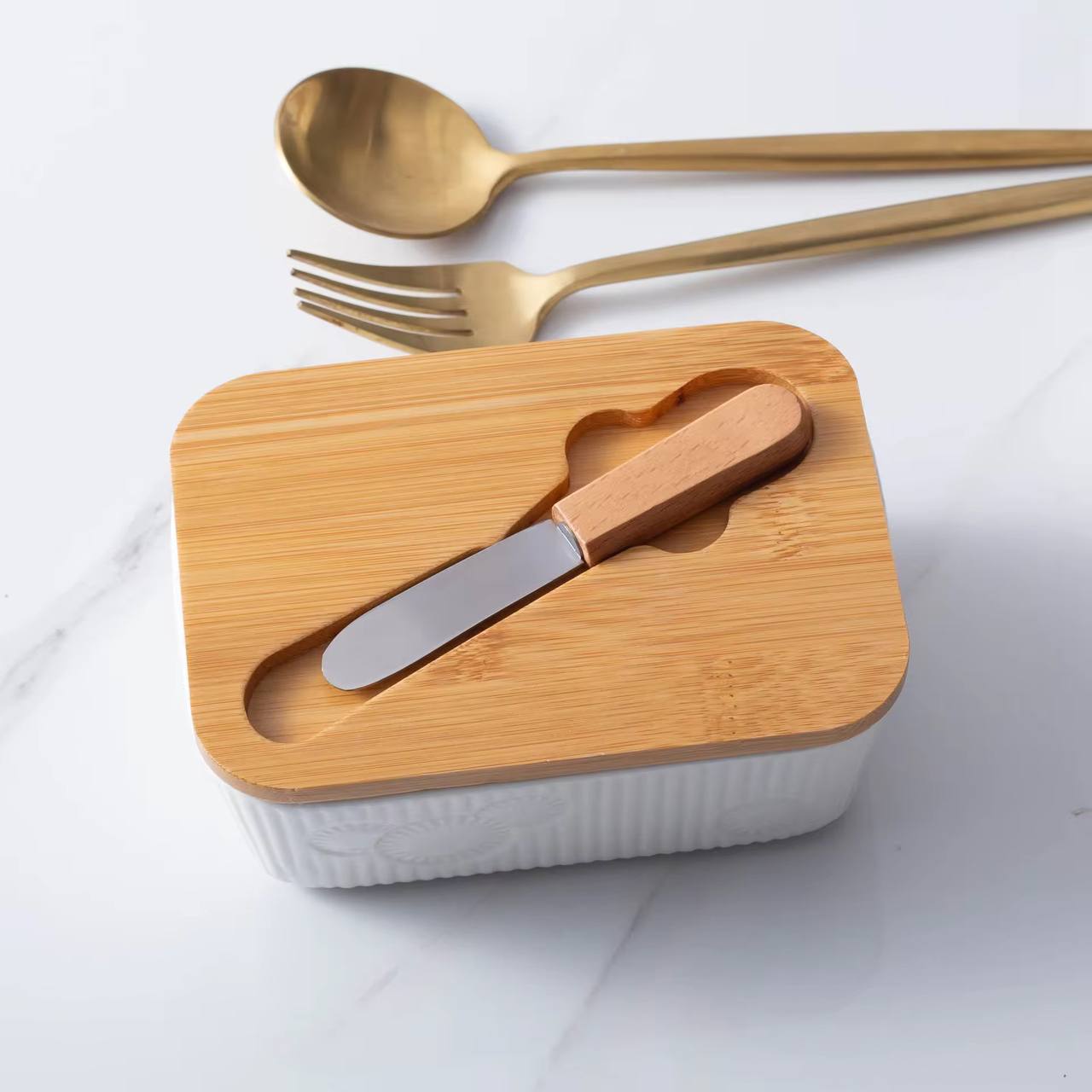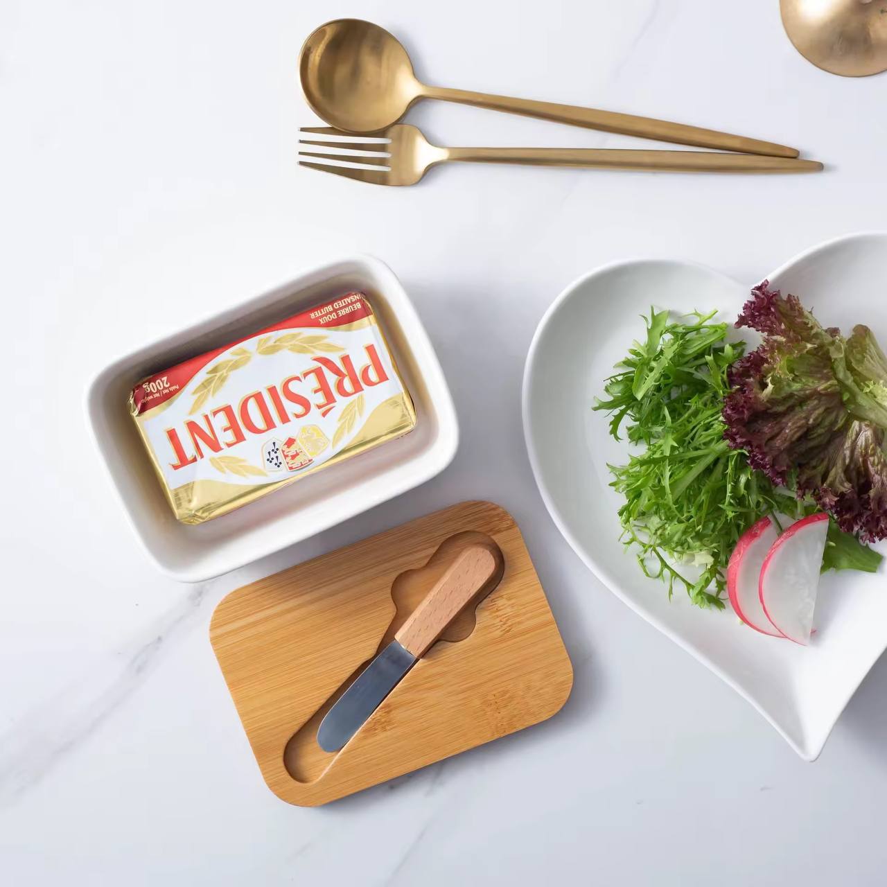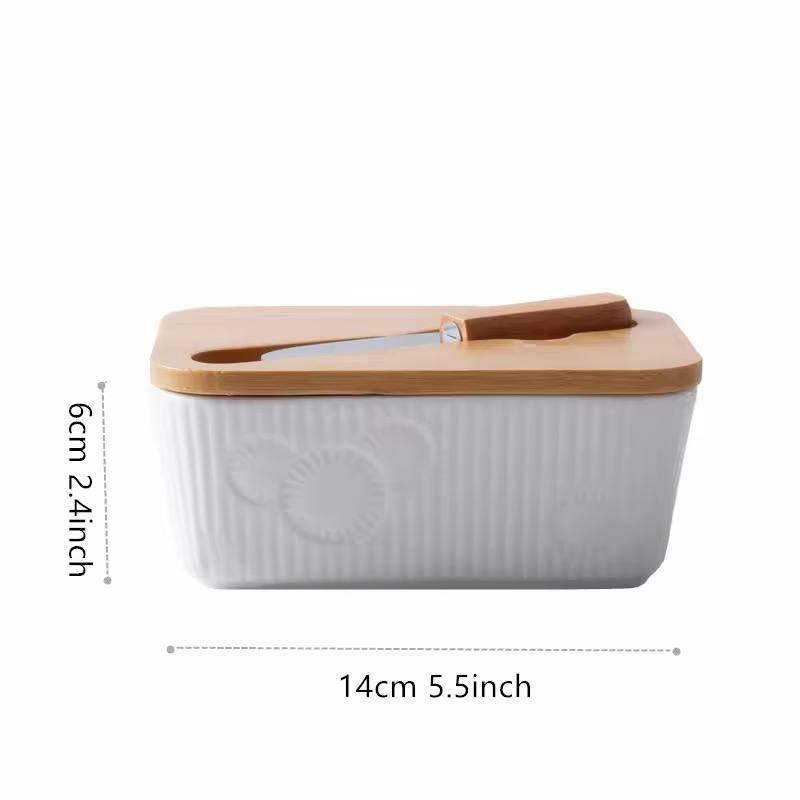 Keep your butter fresh with our Porcelain Butter Set. Made from durable porcelain, it features a bamboo lid with a sealing ring to preserve freshness. The 400ml capacity, included butter knife, and non-slip base make it easy to clean and use.