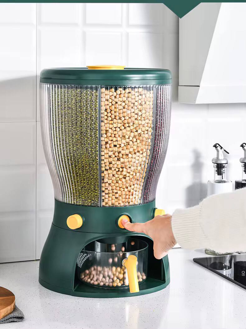 Keep cereals fresh and accessible with this green rotating 3-partition dispenser. Spacious 5-liter capacity, perfect for organized, mess-free breakfast storage.