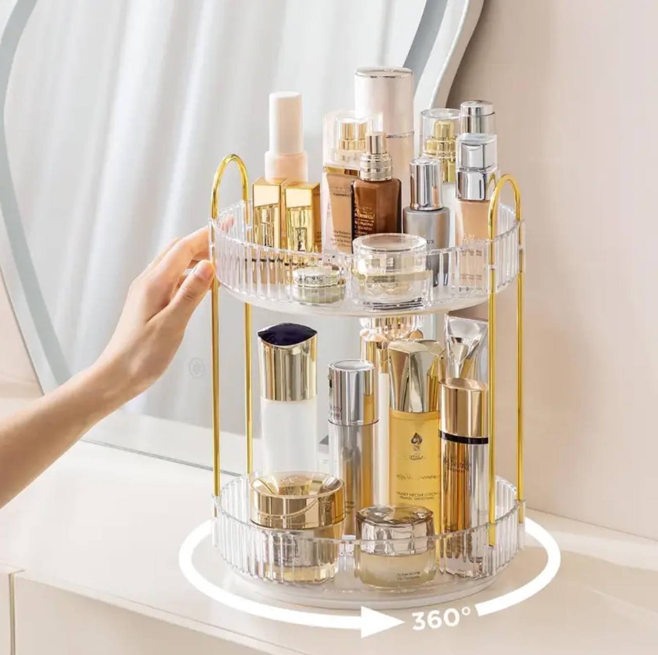 Organize your beauty essentials with this 360° rotating makeup stand! Designed with high-edge trays to prevent spills, its sleek acrylic build adds elegance to any space. Easy to assemble and compact, it keeps your cosmetics accessible and perfectly arranged. Upgrade your vanity today