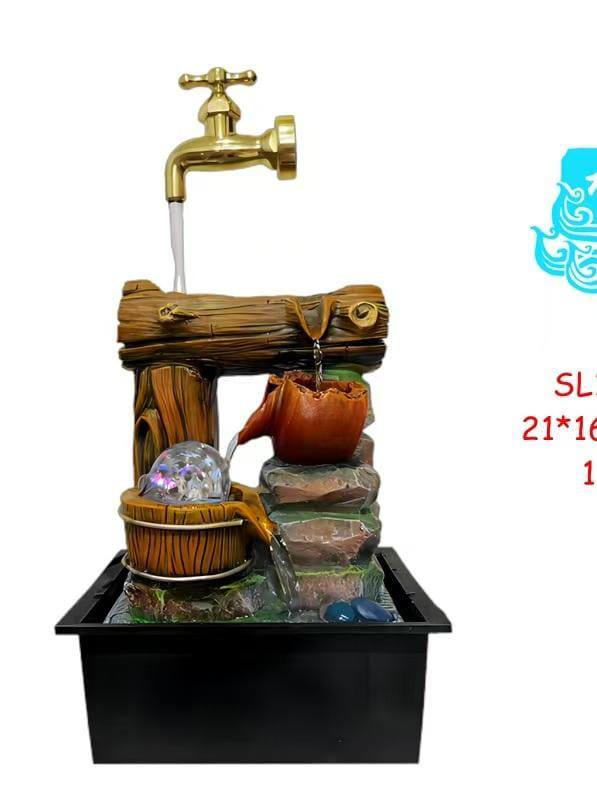 Create a magical ambiance with this rustic flow LED tabletop fountain. Featuring a floating faucet illusion and multi-level cascade through jugs and barrels, it blends wood, stone, and ceramic aesthetics for soothing sights and natural water sounds.