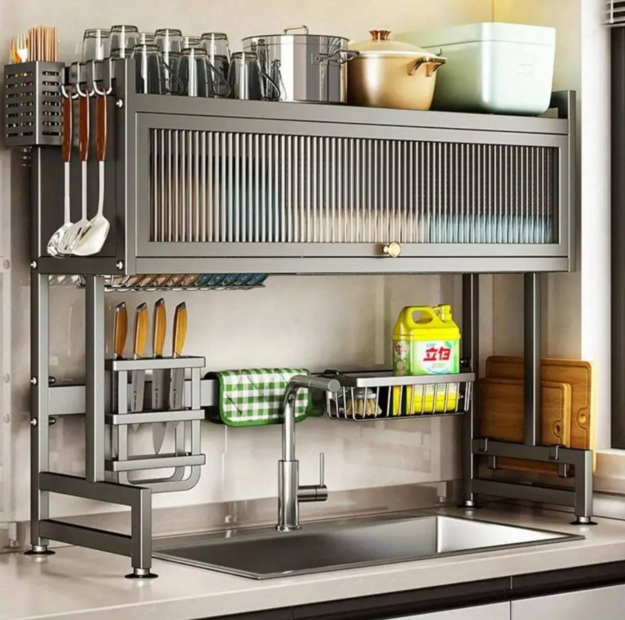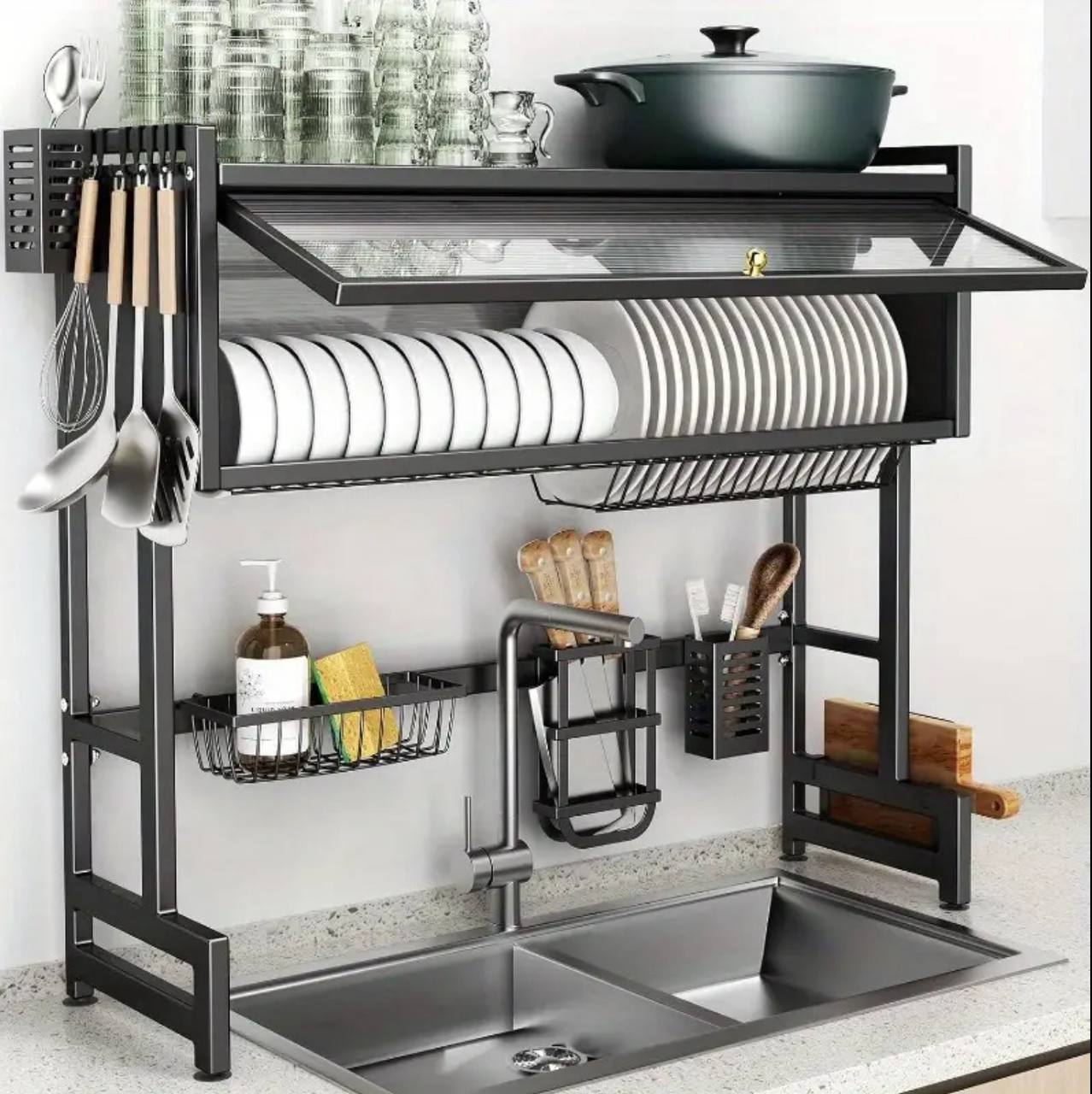 Keep your kitchen organized with our Single Over-the-Sink Rack featuring a Glass Acrylic Cover (32×12.6×17.3cm)! Stylish, practical, and space-saving, it protects dishes from dust while providing easy access and a sleek, modern look.