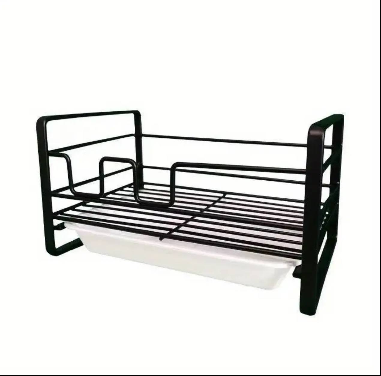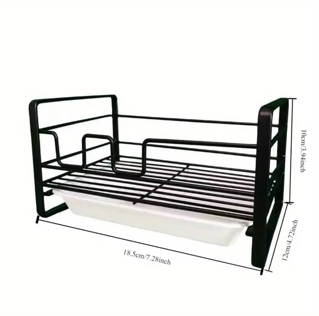 This black sink caddy with a draining tray is made of durable carbon metal. Measuring 18.51210cm, it efficiently organizes your sponges, brushes, and utensils while ensuring excess water drains away, keeping your sink area tidy and dry.