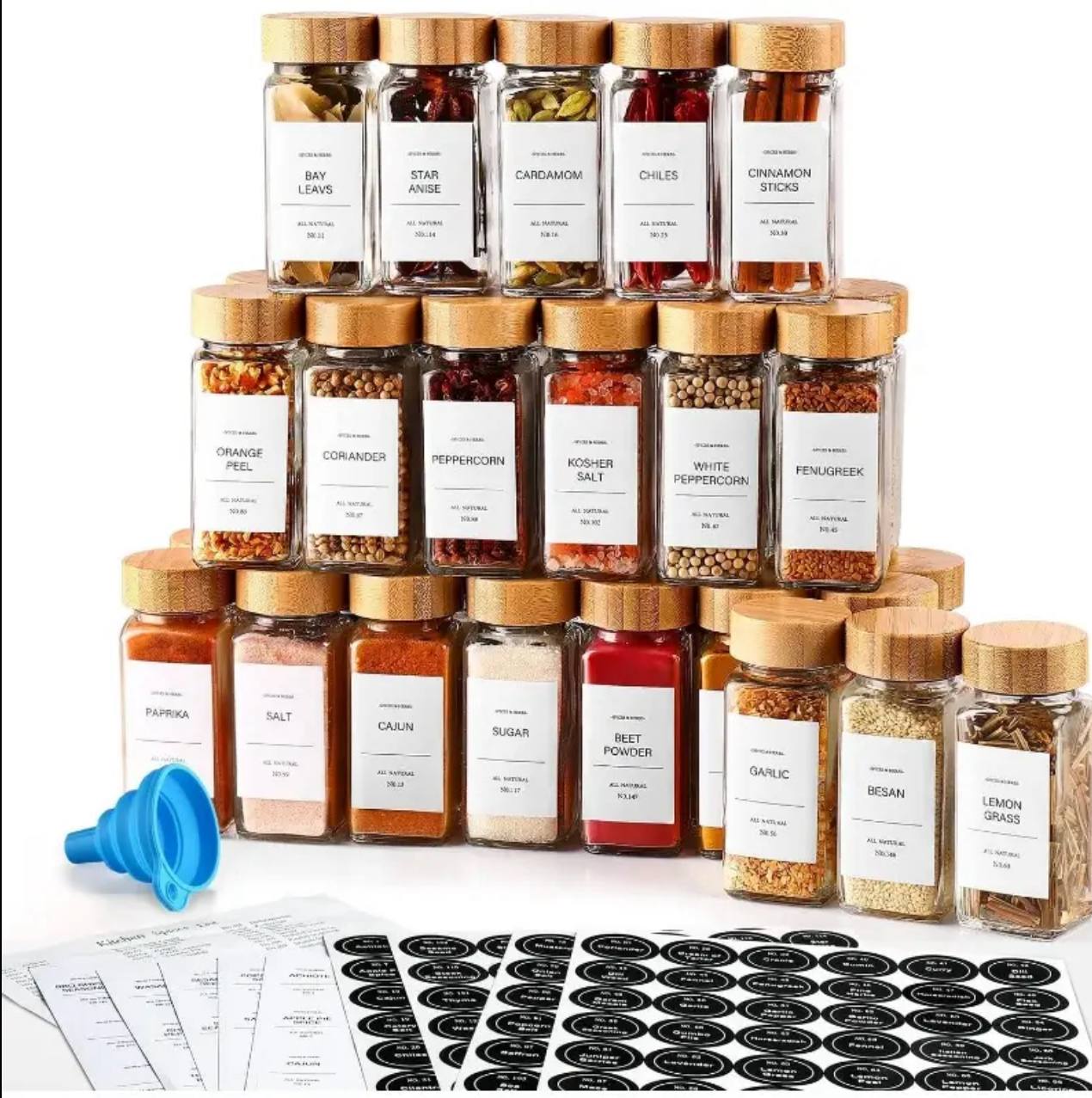 Keep your kitchen neat with our Glass Spice Jar Set featuring bamboo lids. Includes a silicone folding funnel, cleaning brush, white pen, 72 black round labels, and 48 white square labels. Available in 12 or 24 pieces.