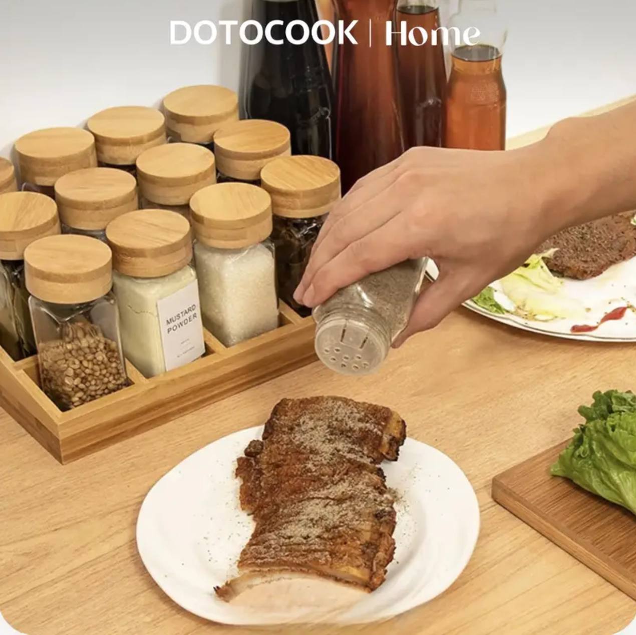 Organize your spices beautifully with this 12-piece spice jar set with a bamboo stand! Each 120ml jar features a transparent design and airtight bamboo lid. Includes a pen, 40 blank stickers, 18 labeled stickers, a funnel, brush, and a sleek bamboo tray