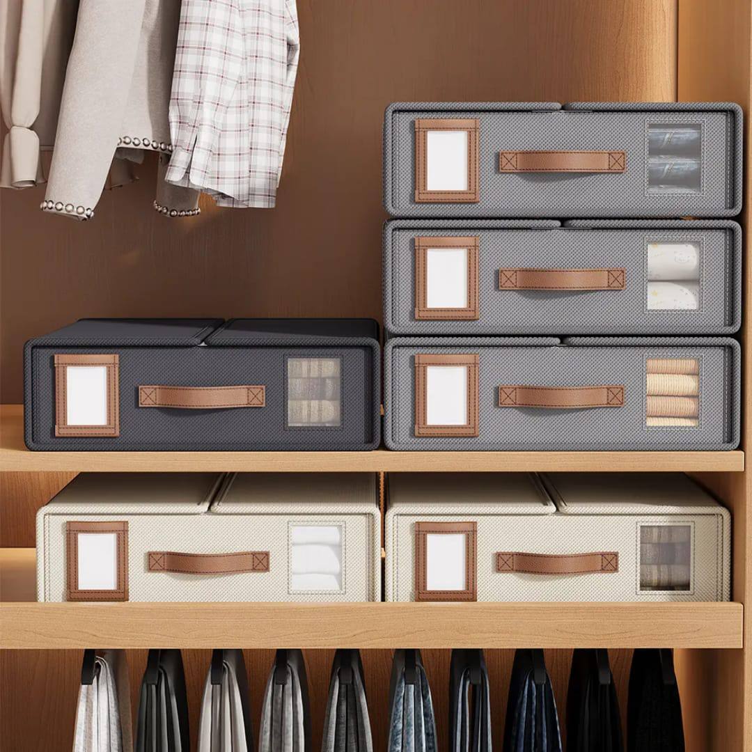 Organize with ease using this stackable fabric closet storage box in black and gray. Featuring a sturdy design, front handle, label holder, and transparent windows, it’s perfect for neatly storing clothes, linens, accessories, and essentials.