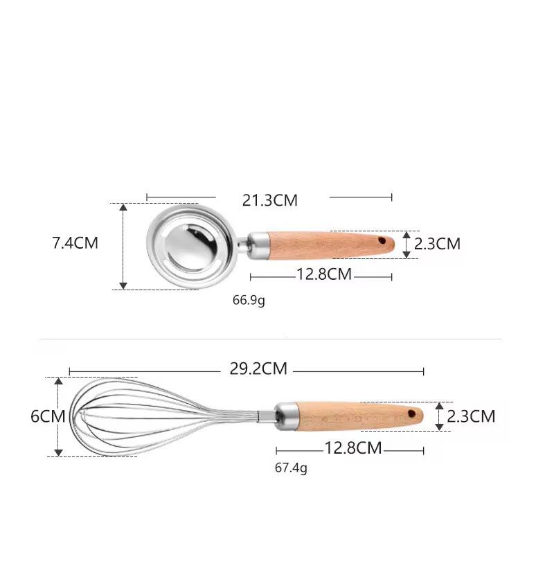 Add elegance to your kitchen with our stainless steel accessories featuring smooth wooden handles. Includes whisk, spatula/scraper, and ice cream scooper—perfect for cooking, baking, and serving. Durable, stylish, and functional—designed to elevate your kitchen experience with every use.