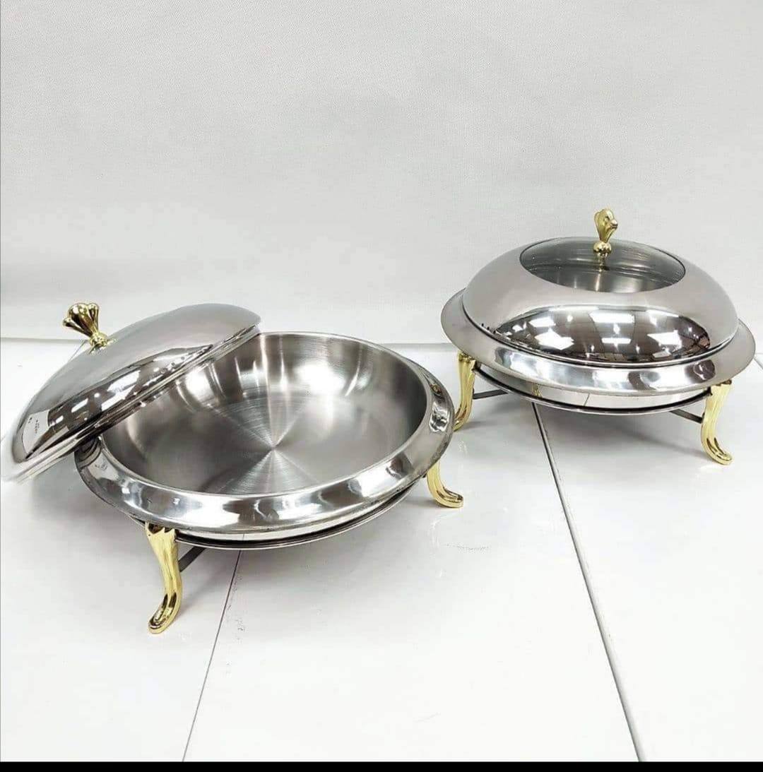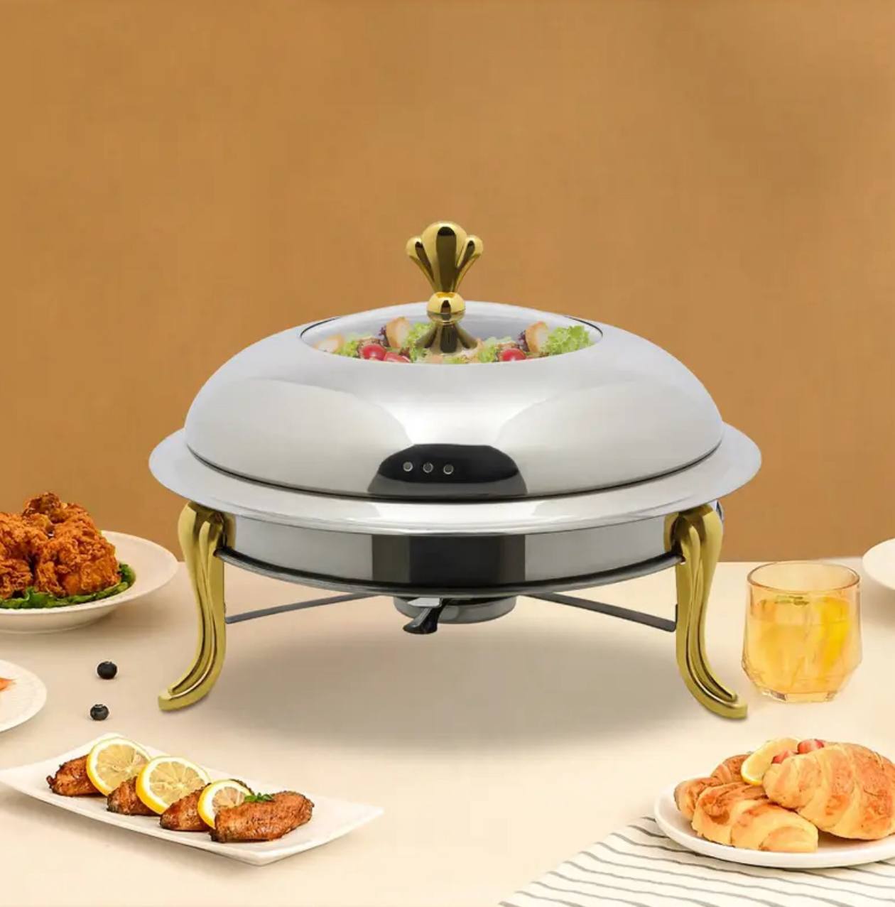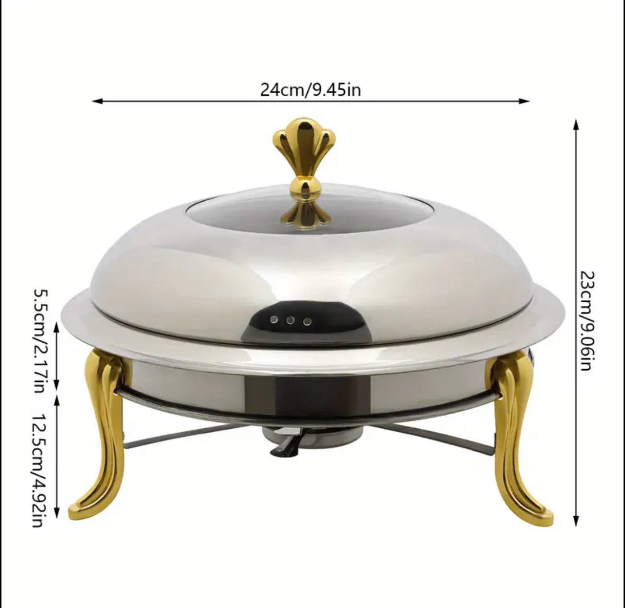 Elevate your dining experience with this 28cm stainless steel chafing dish food warmer, featuring elegant golden accents. Perfect for buffets and events, it keeps food warm while adding a luxurious touch to any setup.