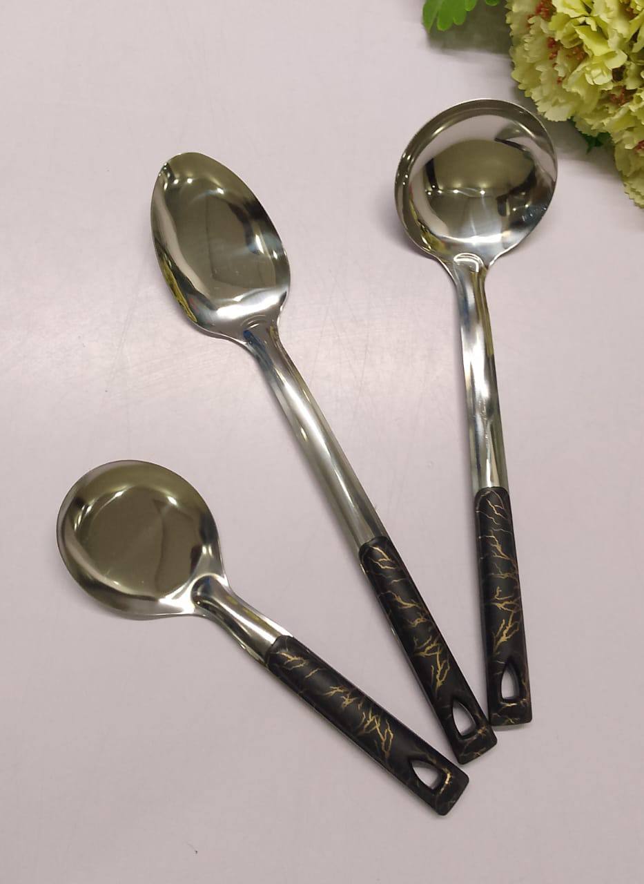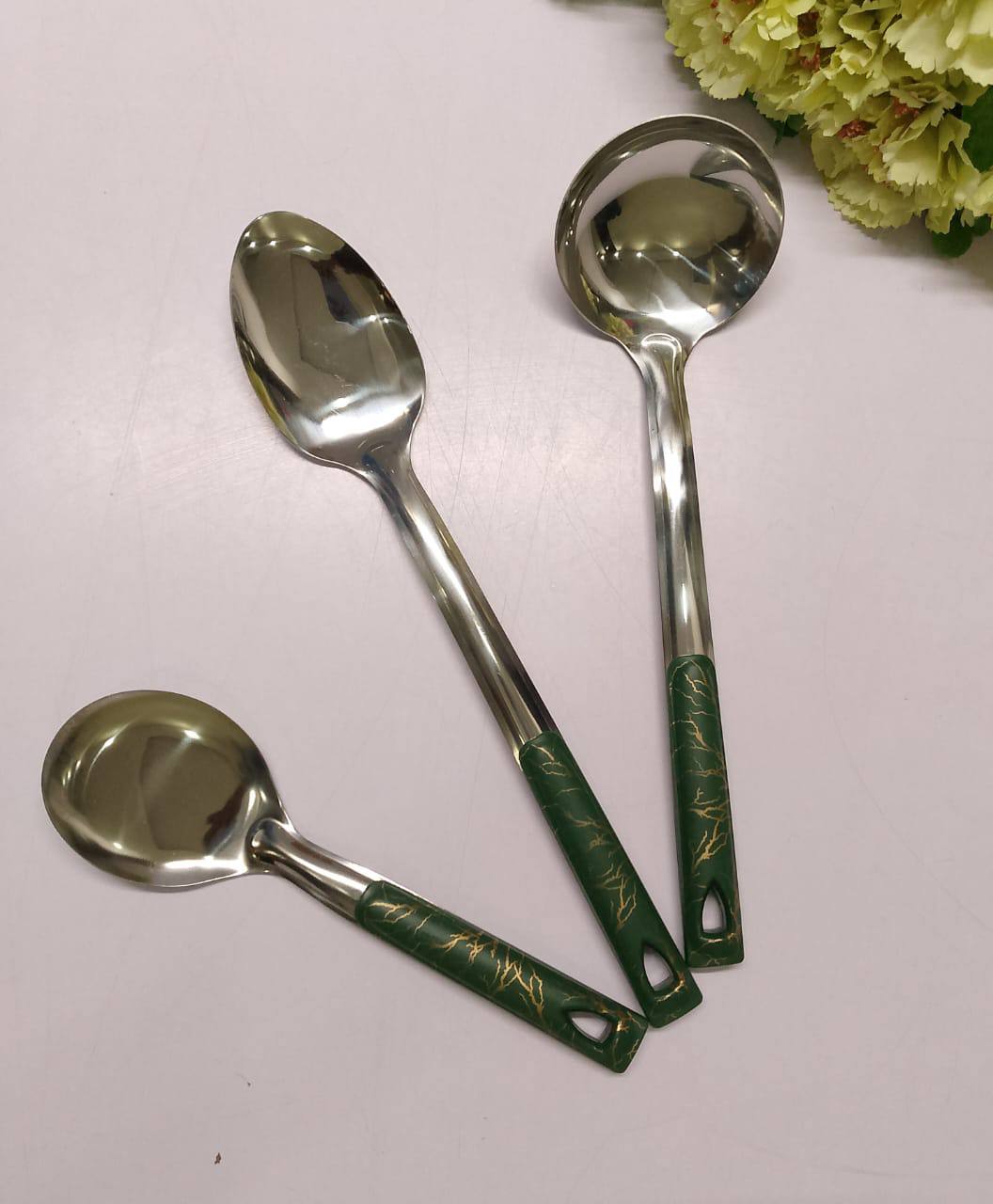 Premium stainless steel silver serving spoons with elegant green-in-black marble-style handles. Available in 3 versatile types for all your serving needs. Durable, stylish, and perfect for everyday use or special occasions — add a touch of class to your table.
