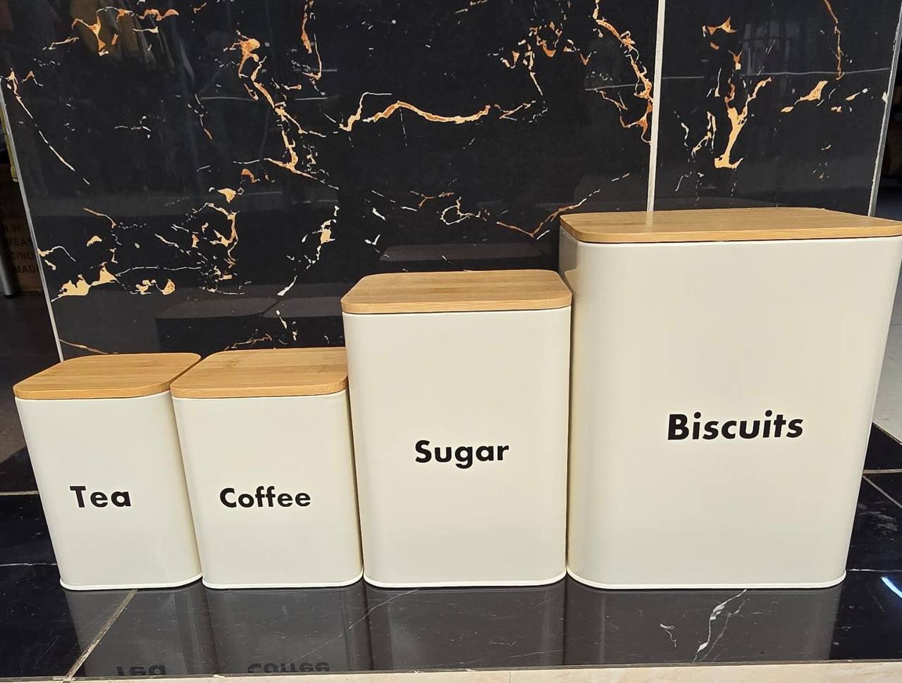 Organize your kitchen with our Storage Jars Set, including Biscuit, Tea, Sugar, and Coffee canisters. Made from durable galvanized alloy with stylish bamboo lids, they’re available in black and white, adding a modern touch to any countertop.