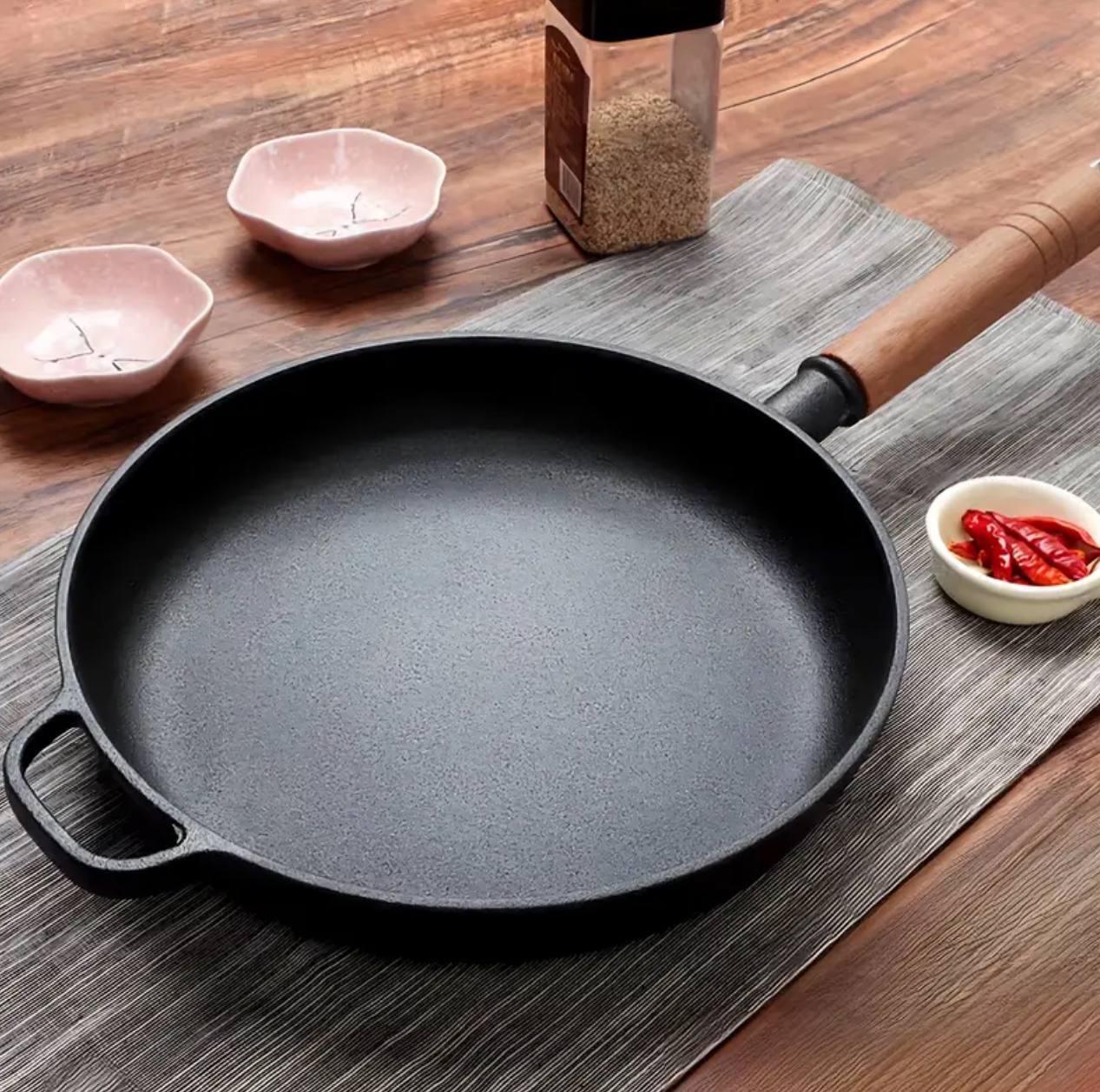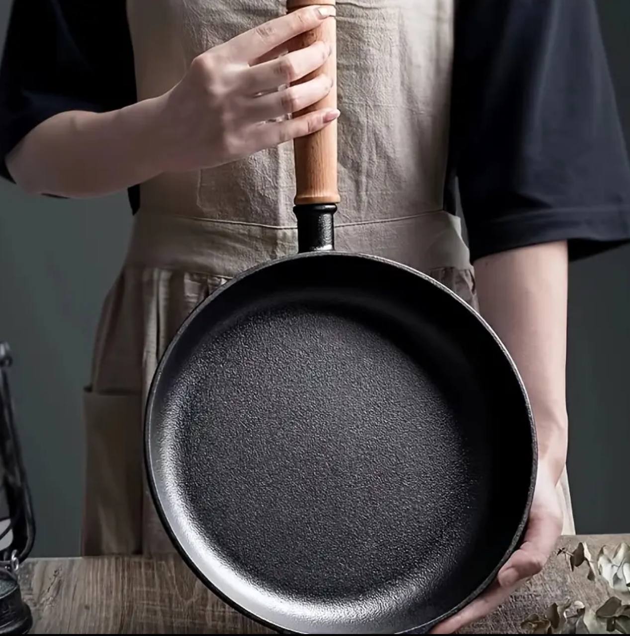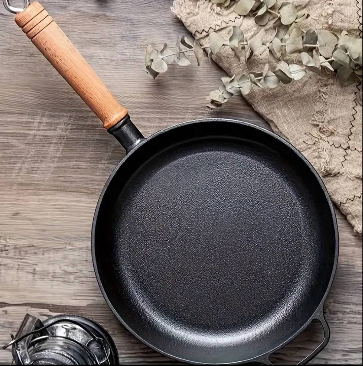 Upgrade your kitchen with our 25cm thickened cast iron frying pan featuring a bamboo lid. Its non-stick surface is perfect for frying and making chapatis. Durable, heavy-duty construction ensures even cooking for delicious results every time