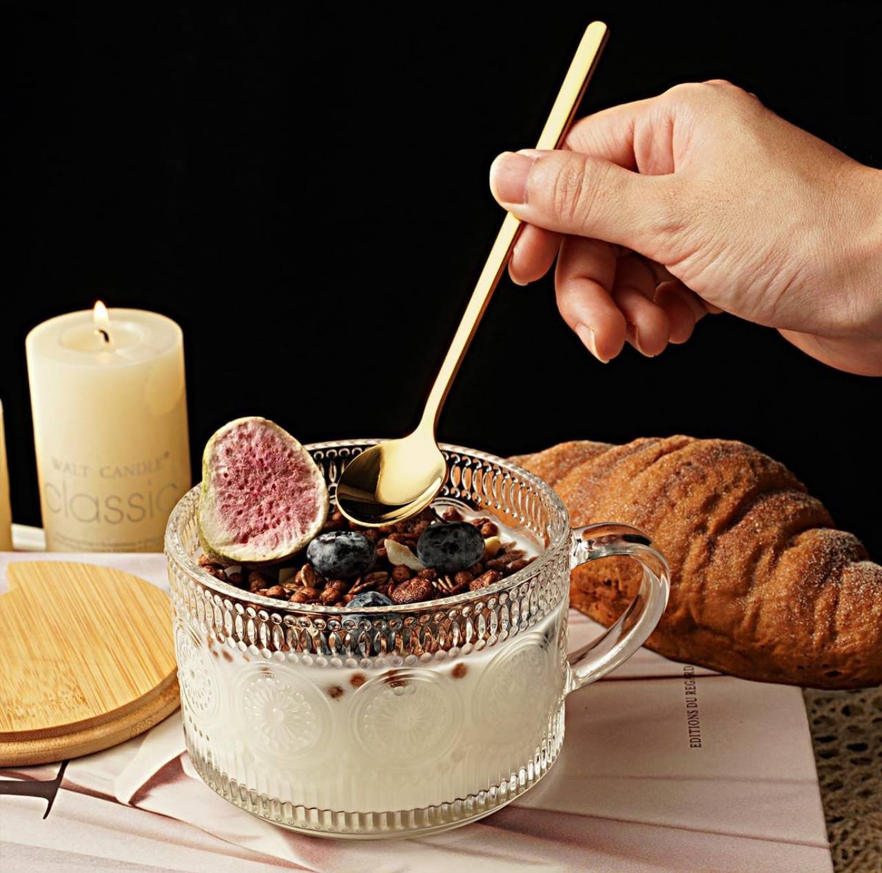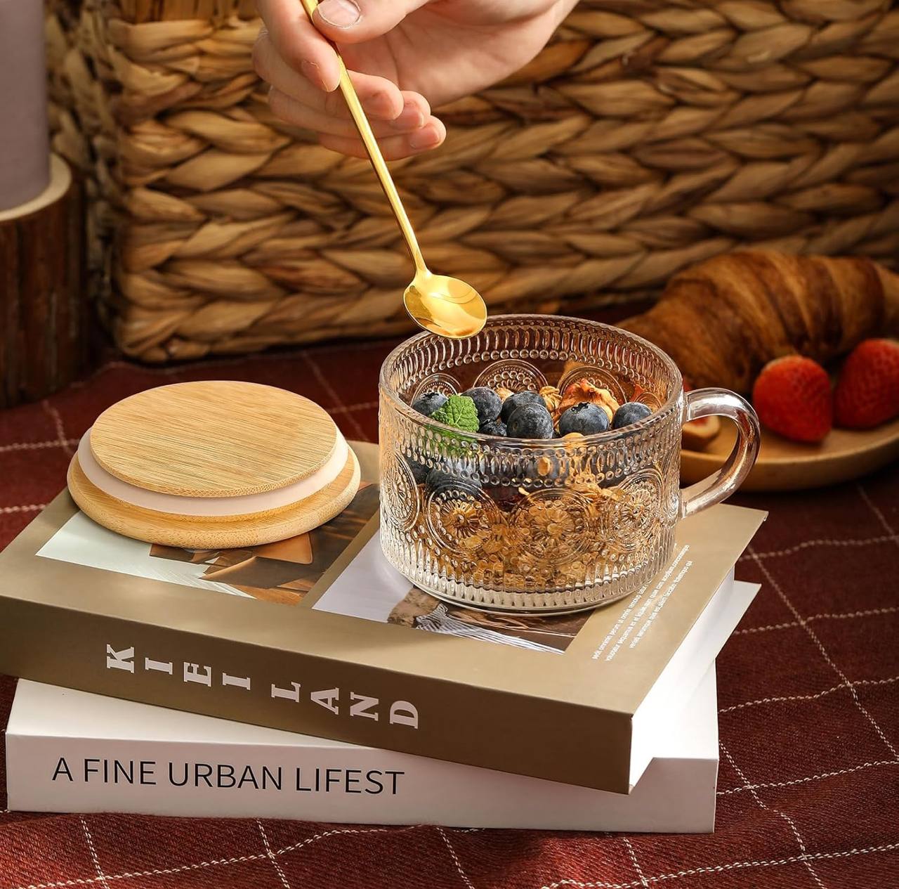 Add elegance to your drinkware with our Vintage Glass Mug! Perfect for coffee, cereal, or fruits, it features a stylish bamboo lid and a golden spoon. Capacity: 370ml, with beautiful prints as displayed—a multifunctional and charming addition to any kitchen!
