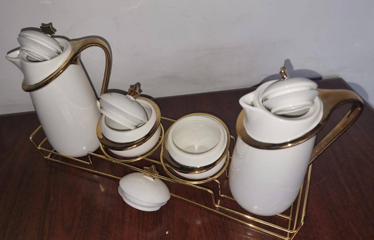 Luxurious JC7923 7pc Acar Ceramic Golden Set — includes 2 jugs (840ml) and 2 sugar dishes (220ml) with airtight lids. Elegant gold accents preserve freshness, making it perfect for stylish serving and gifting in any setting.