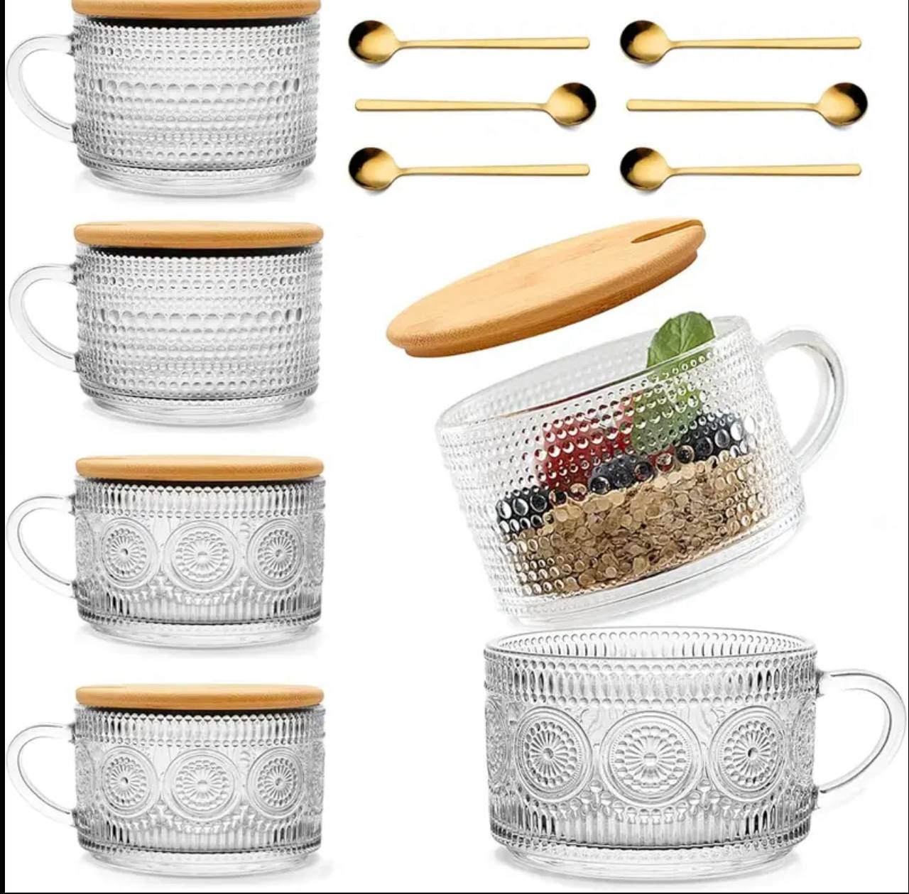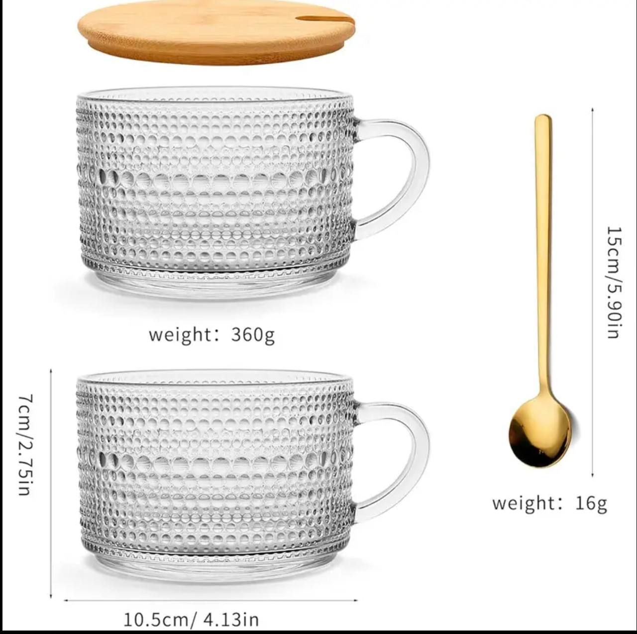 Add charm to your mornings with our 4-piece Vintage Embossed Glass Coffee Mug Set. Each 400ml cup includes a bamboo lid and metal spoon — perfect for coffee, tea, milk, or oatmeal in timeless style.