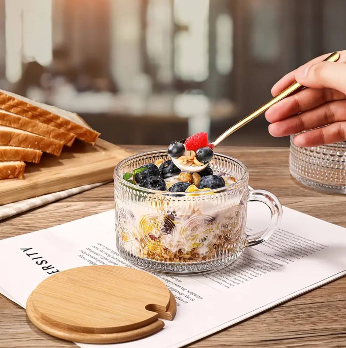 Sip in style with this Vintage Glass Mug, perfect for coffee, cereal, or fruits. Featuring a 370ml capacity, elegant prints, a bamboo lid, and a golden spoon, it’s a must-have for every kitchen. Aesthetic, multifunctional, and perfect for gifting