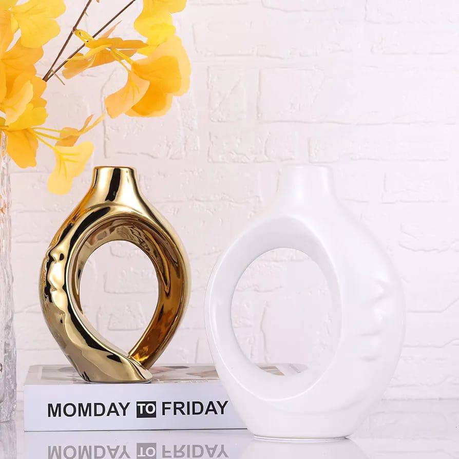 White and Gold Ceramic Vase with Hole – Modern Nordic minimalist design, perfect for table centerpieces, weddings, dining rooms, living rooms, offices, or home décor. Sizes: Small (17622 cm) and Large (15.51218 cm). Elegant, stylish, and versatile for any setting.