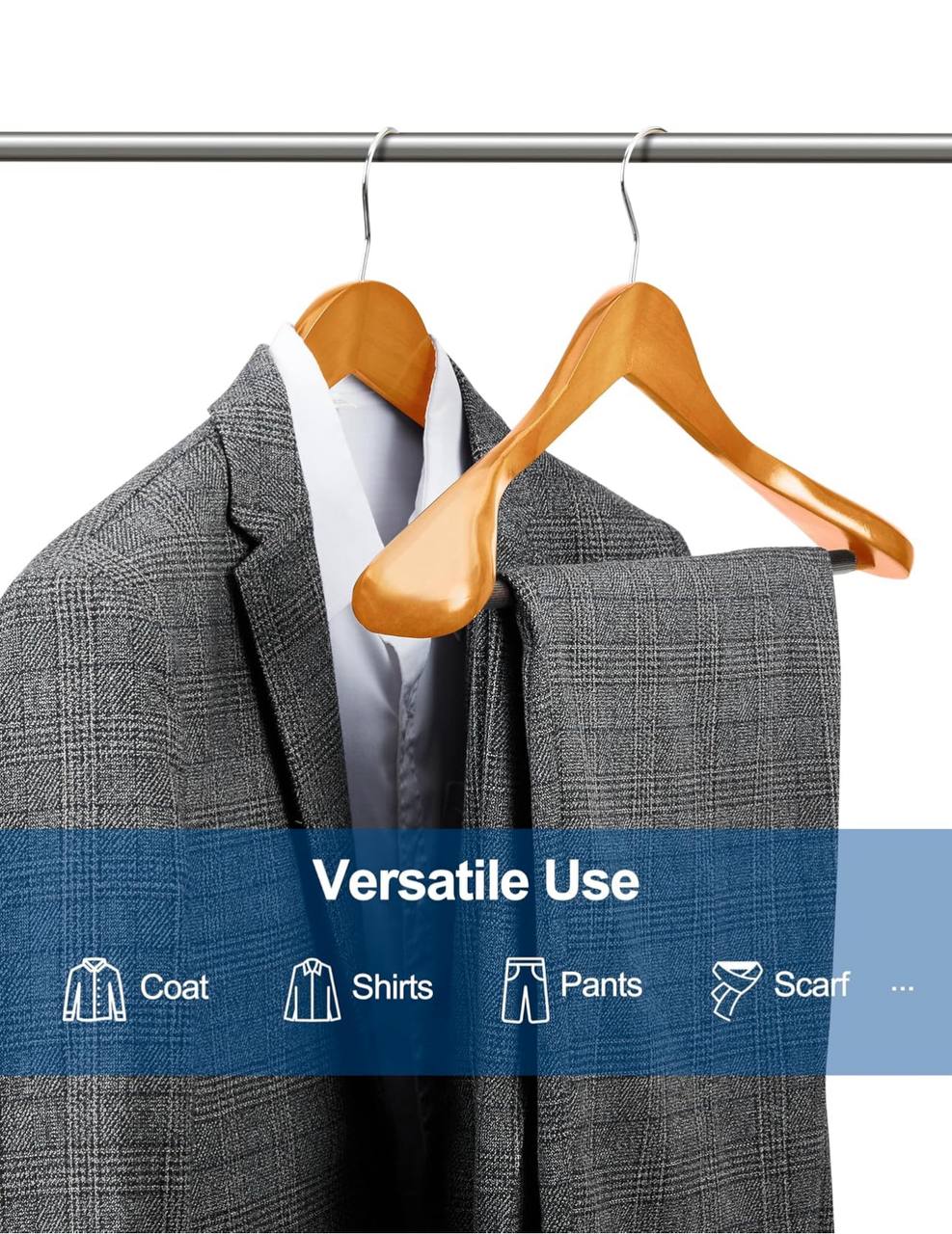 Organize in style with this 10-pack of wide wooden hangers. Featuring a glossy finish, strong build, and non-slip design, they offer excellent support and prevent creases—perfect for coats, suits, and delicate garments.