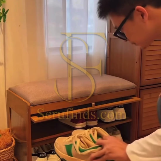 This multifunctional wooden stool with built-in shoe cabinet offers smart storage and comfortable seating. Ideal for entryways or bedrooms, it keeps your shoes organized while adding a warm, stylish touch to your home décor.